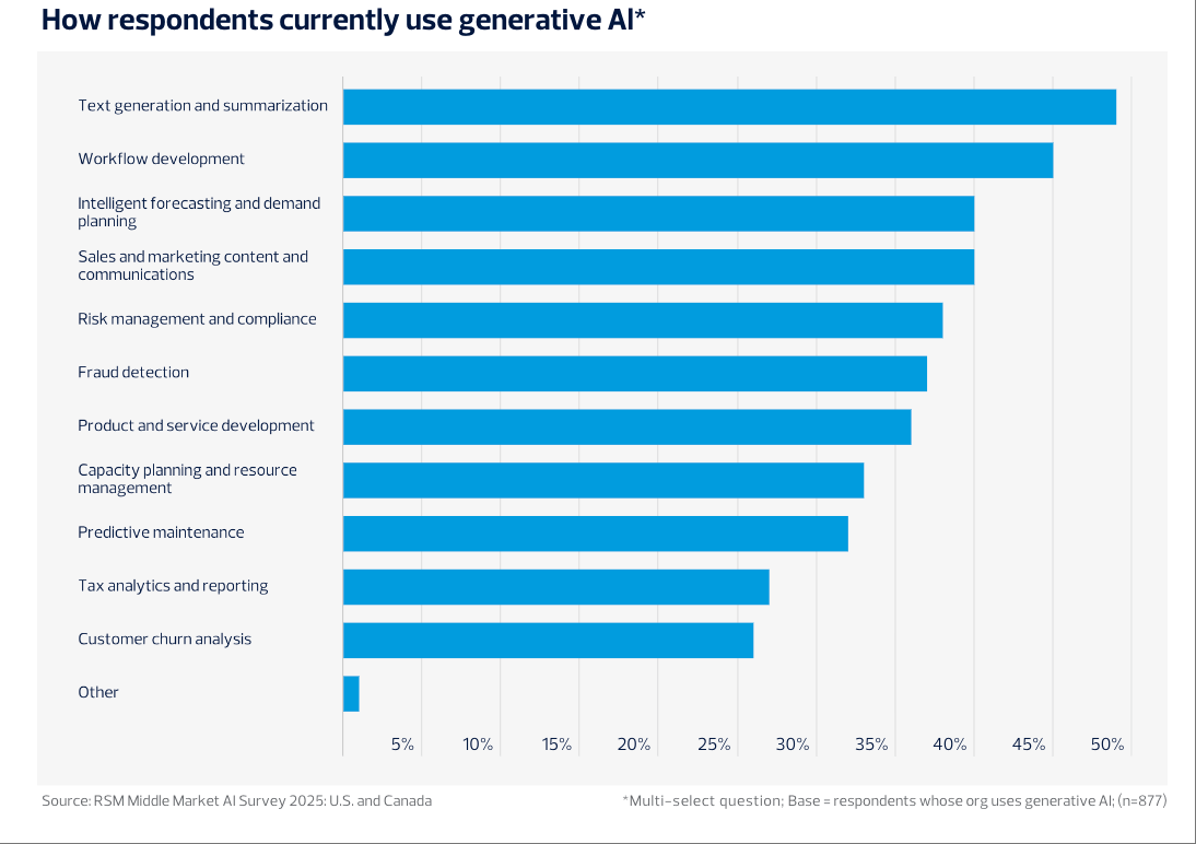 RSM的调研成果显示,数据阐发(58%)、IT优化(57%)以及客户办事(48%)是AI使用最为集中的三个部分,41%推出AI素养培训。凸显生成式AI正在中端市场的敏捷普及取支流地位。