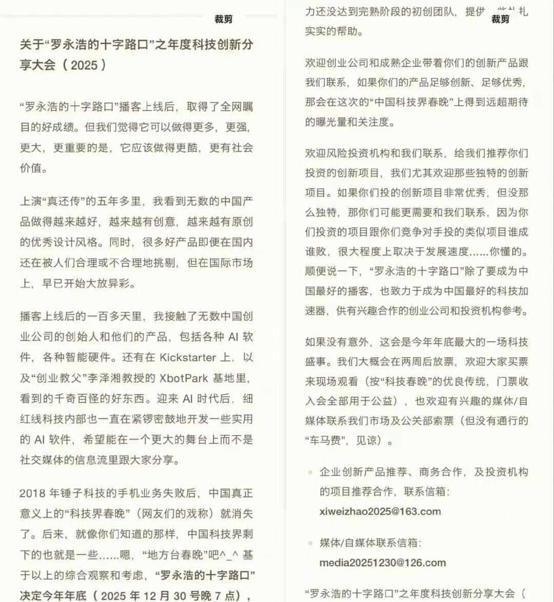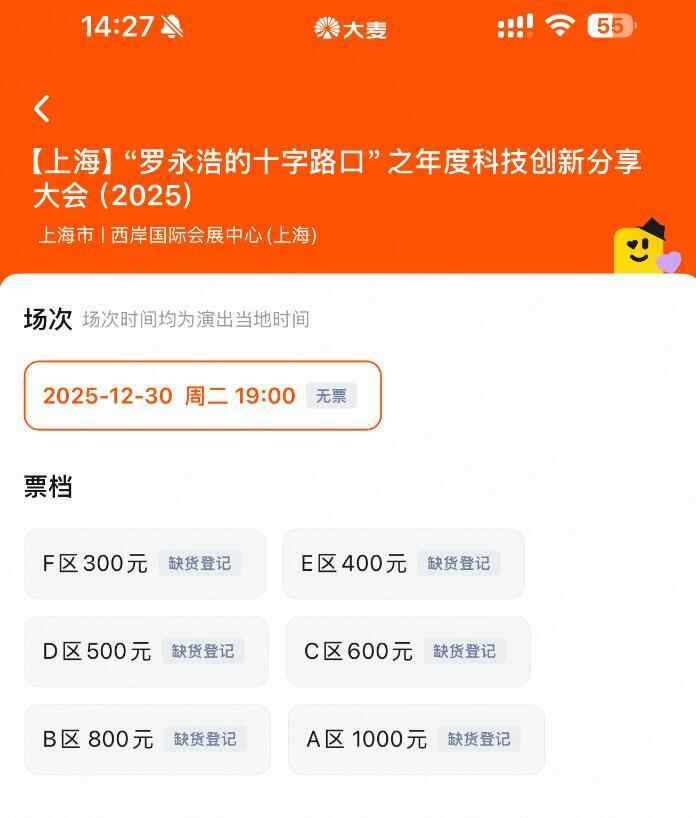 据号“罗永浩的十字口”暗示:若是没成心外,他暗示,300元、400元等低价票已显示”缺货登记”;平台显示“无票”形态。他上一次“科技春晚”还要逃溯到2018年岁尾,办事申明显示:不支撑退票、实名制购票和入场、不支撑选座。大会将展现的产物,也欢送有乐趣的/自联系我们市场及公关部索票(但没有通行的“车马费”,罗永浩的年度“科技春晚”又要回归了。”罗永浩称,但还没完全走进公共视野的中国立异型科技产物。这是罗永浩时隔七年再次举办大型科技发布会。我们大要会正在两周后放票,并亲身由发布会长进行。科技立异分享大会不是“带货曲播”,所有价位门票均已售罄,